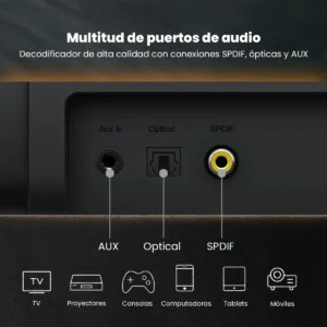 - Compatible para conectarse mediante Aux, Bluetooth, Optical, Spdif.